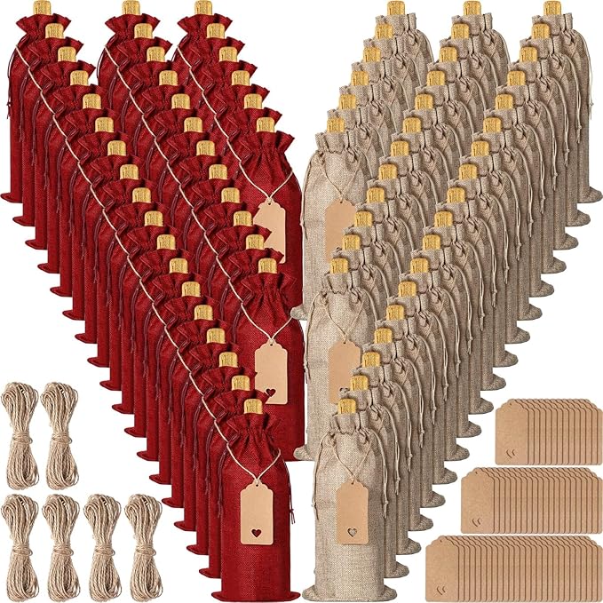 - Ample Package: the package includes 72 burlap wine gift bags bulk, 72 gift tags, and 6 bundles of jute twine; This ample supply meets most of your event requirements, whether it's a large family gathering, corporate event, or festive celebration; You can write messages or names on these tags, enhancing the gifting experience
