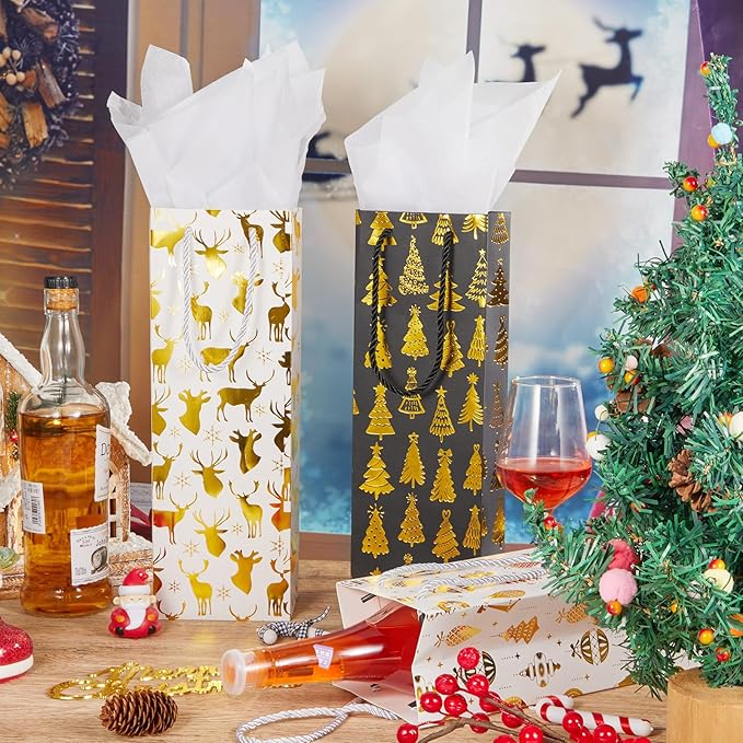 - Plenty of Supplies: there are 32 Christmas wine bags in 4 styles and 32 sheets of tissue paper, enough to pack your wine bottles this winter; Wine bag design is exquisite, printing is clear; You can use them to wrap your holiday gifts and the person receiving the gift will feel happy