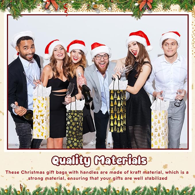 - Quality Materials: these Christmas gift bags with handles are made of kraft material, which is a strong material, ensuring that your gifts are well stabilized; The kraft paper of the wine bag is tear resistant, while the thin paper is simple and elegant, which is the ideal combination of gift packaging