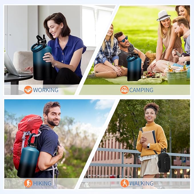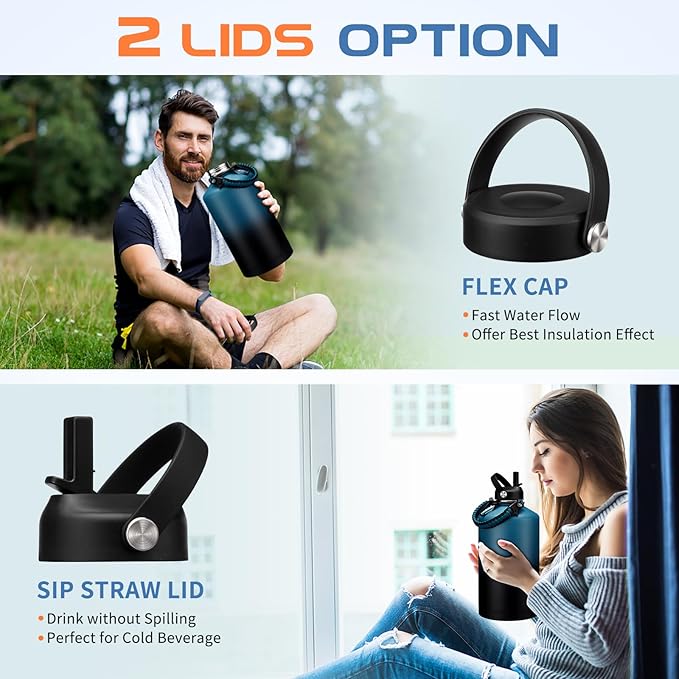 - LEAK-PROOF 2 LIDS OPTION: The 1 gallon water bottle insulated is equipped with two individual lids to keep beverages fresh and intact all day without transfer of flavor. The wide mouth bottle with flex cap for easy drinking and strong tightness for no leaks when you're on the go. The hands-free straw lid for spill-proof sipping, and package come with a alternative straw & a straw brush for easy cleaning