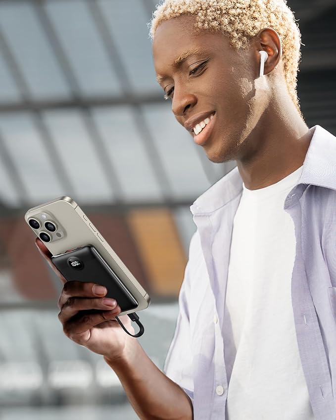 - [ PowerBank Fast Charging ] This USB-C power bank, featuring PD 3.0 and QC 3.0 fast charging protocols, delivers up to 22.5W of output, charging the iPhone 15 three times faster than standard chargers. With the built-in USB-C input cable, the power bank itself recharges from 0% to full in just 3 hours