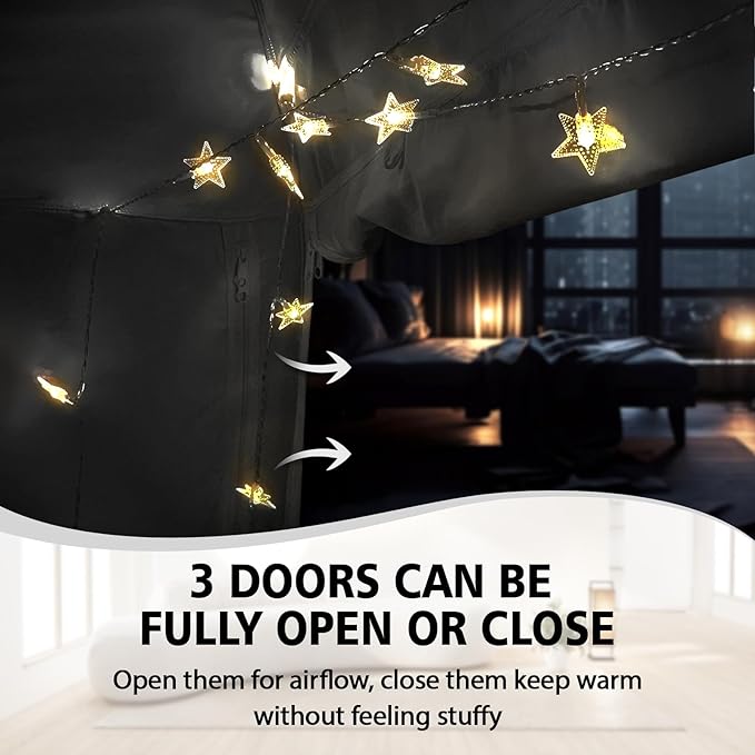 - Breathable Unstuffy: The 3 double-sided zippered doors of the bed tent can be fully opened for ventilation. when you closed 3 doors, the mesh on both sides promotes air circulation, keeping you warm without feeling stuffy.
