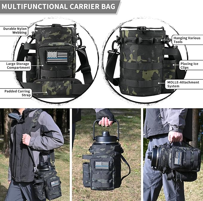 - 【Tactical Bag For Easy Carring】:Our water bottle holder is made of double-layer polyester and insulating Oxford cloth, which provides protection for the water jug. The water bottle bag also adds warmth, making it more effective in maintaining cold or hot. It has a detachable shoulder strap for carrying and a hand support strap on the side for easy pouring of water. Water bottle carrier bag has MOLLE webbing attachments and a large storage compartments for your phone, keys, wallet and more.
