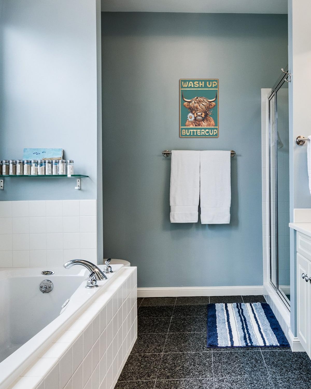 ALKB Highland Cow Sign Bathroom Wall Cow Painting for Western & Highland Cow Lovers - Funny Wash Up Sign 8 x 12 Inch