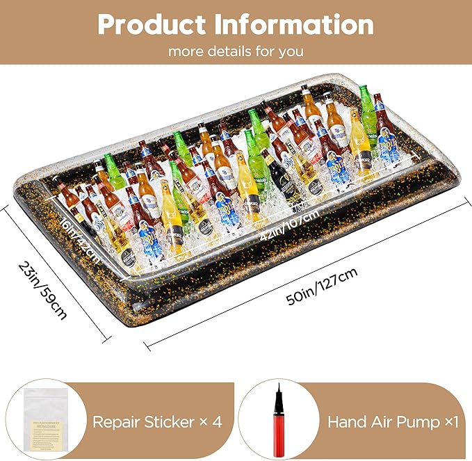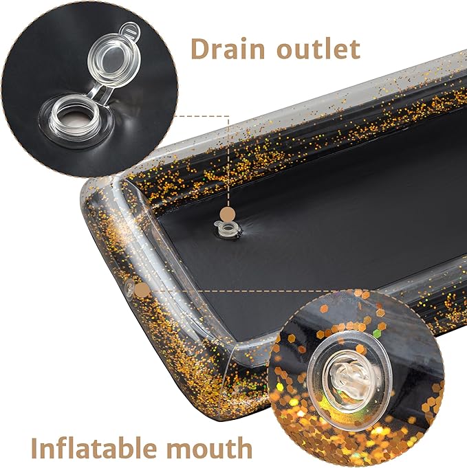 - ULTIMATE BAR: Keeps your food and beverages chilled. Lightweight, inflatable, and extremely portable. It features a clear drain plug on the bottom for quick and easy draining if you need to refill with ice. this inflatable buffet server can even float in your pool!
