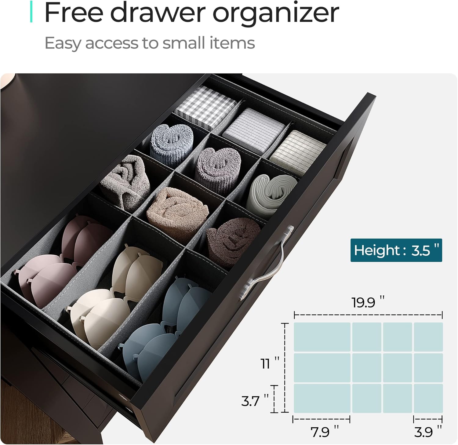 - Space Saver Extraordinaire: Picture this: 5 drawers that can swallow up all those clothes, cozy blankets, and more, measuring 20.7” L x 13” W x 4.7” H. It's like a TARDIS for your stuff. Plus, we've amped up the sturdiness with some corner blocks – because flimsy furniture? Ain't nobody got time for that.