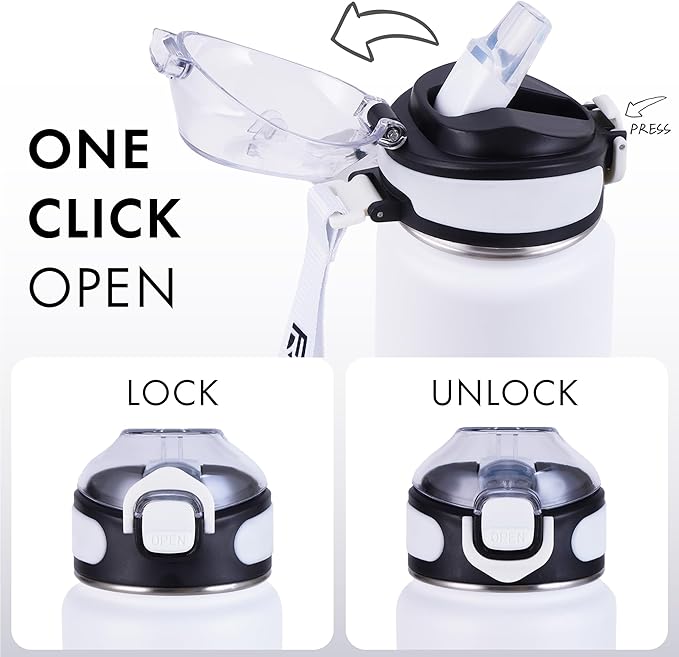 - One-Handed Use: Our flip top is designed to be opened with just one hand and a press of a button! The top is fitted with a silicone straw for sipping. Easy and convenient to use when exercising at the gym, driving, and even while riding your bike.