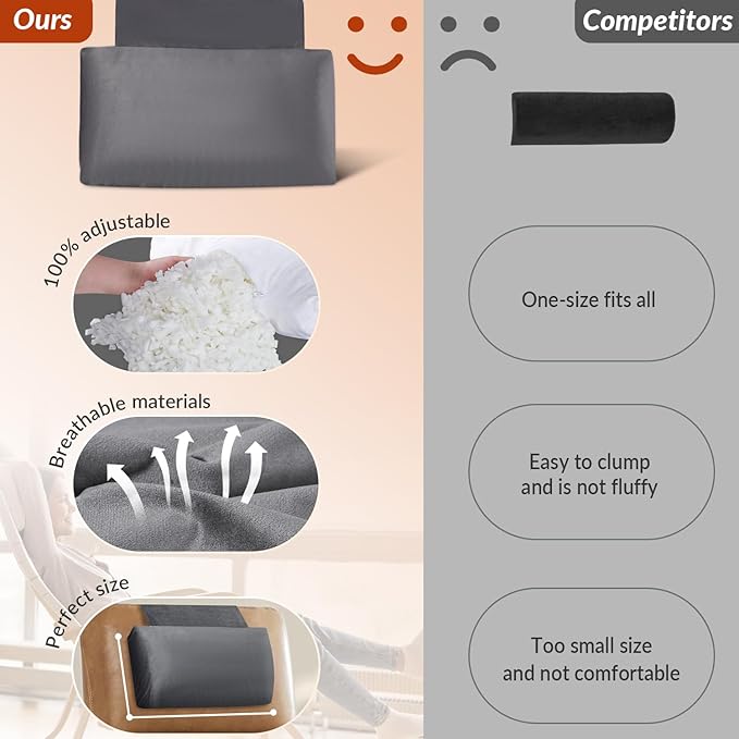 - [Adjustable Loft and Firmness] Too hard, too firm, too soft, no support? The adjustable recliner head pillow provides softness, and offers firm support. Unlike traditional microfiber pillows, the headrest pillows features a zippered inner and outer cover, you can ADD or REMOVE foam filling to suit your size, find the comfort level and provide the ultimate rest experience.