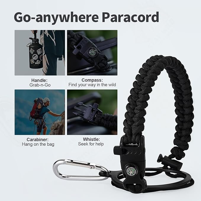 - Palm Fitting Paracord Handle: Compared to handle lids, nylon paracord on the bottle gives you more choices in terms of color coordination and coziness on your hands. Match the handle with your bottle to make a complete outdoorsy look. Compass and carabiner can be lifesavers for hiking and other expeditions