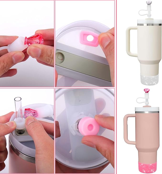 - [PERFECT LOOK AND DESIGN]:Our set adopts the same color scheme, made of pink and white sets, and the diamond straw cap and shiny bottom protector echo each other, shining, very eye-catching and easy to identify and differentiate your cups, unique shapes and colors make your cups no longer monotonous, unique and dazzling, very suitable for your unique temperament