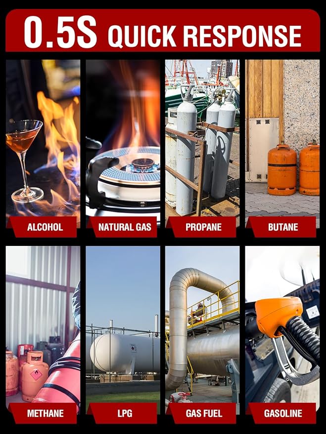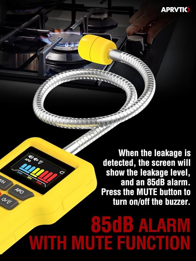 - AUDIBLE & VISUAL ALARM WITH MUTE FUNCTION: Eight colored analog bars and a 85dB audible buzzer help you point out the gas leak location. The Gas Leak Sniffer responds within a rapid 0.5 seconds. Press the mute button to turn off the alarm.