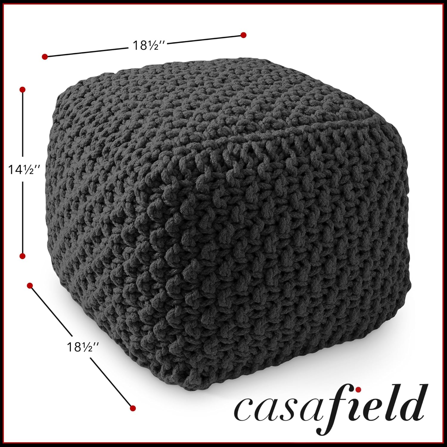 Casafield Square Pouf Ottoman, Black - 18.5" W x 18.5" D x 14.5" H Cotton Knit Foot Stool - Boho Floor Pouffe for Living Room, Bedroom, Home Office