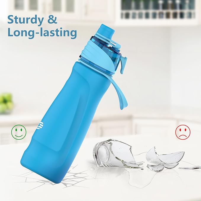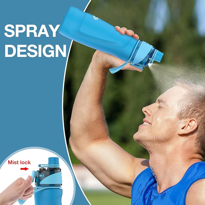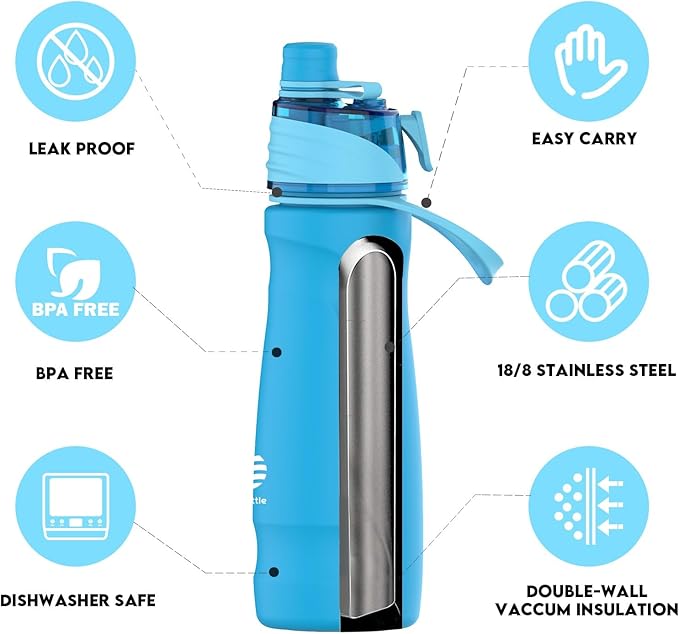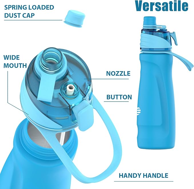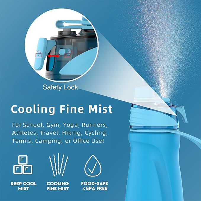 - 【Stay Refreshed All Summer】Introducing our 2-in-1 mist water bottle! Not only does it quench your thirst, but it also features a handy spray function. Just give the trigger a gentle press to release a refreshing mist that keeps you cool and your skin hydrated on scorching summer days. Want an extra chill? Toss in some ice blocks for an intensified cooling effect. Plus, the mist lock ensures no unexpected spritzing when you don't need it.