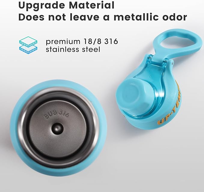 - Made of 18/8 316 food grade stainless steel, the water bottle is durable, it will never leave a metallic taste or rust. Portable carrying handle design makes it easy to carry around on a daily basis. Its wide mouth opening makes filling and cleaning your ice cubes quick and easy.