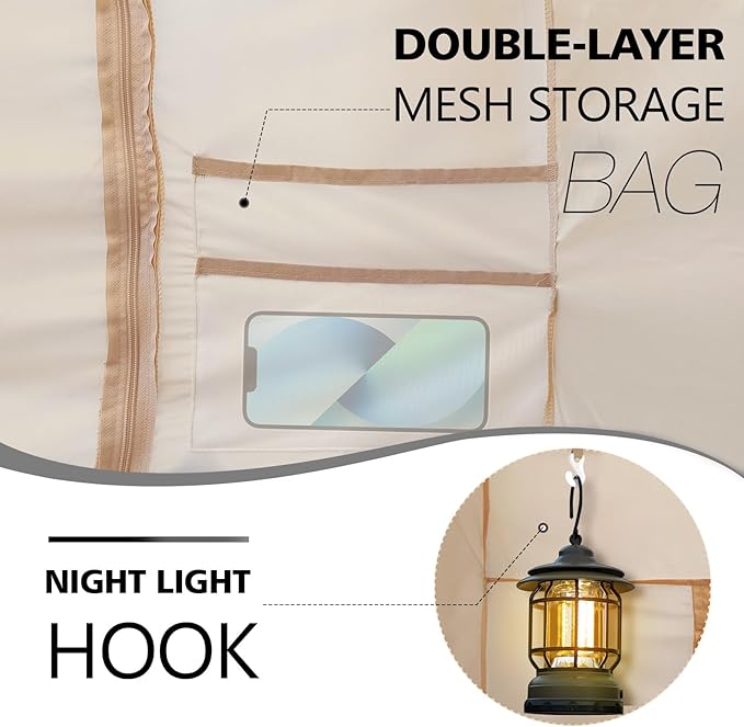 - Multifunctional Use: There is a double mesh storage pocket inside the bed tent to place items. 1 velcro opening to place the charging cable, and 1 night light hooks. Reflective zipper pulls allow you to quickly find the zipper door in the dark