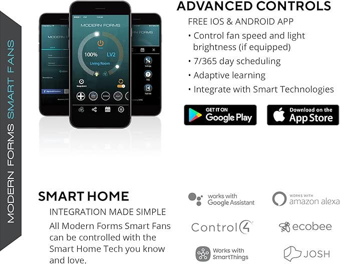 - Free app download: Sync with our exclusive Modern Forms app to control fan speed, use smart features like breeze mode, adaptive learning, create groups, and reduce energy costs. New: Bluetooth compatible for improved range and an unlimited amount of fans can be controlled with remote or wall control within range.