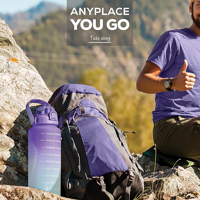- ALL-DAY HYDRATION The ½-gallon water bottle with motivational quotes by the hour keeps you hydrated throughout the day and your daily water intake on track at home, gym, or while you travel