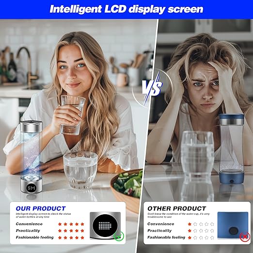 - Dynamic Display : Hydrogen bottle adds user-friendly LCD screen. Visually displays the battery capacity and electrolysis time. Let you know the status of the device at any time. High-quality silver metallic appearance. Mute foam base. Durable and non-slip. Practical and stylish. For office, travel and other occasions.