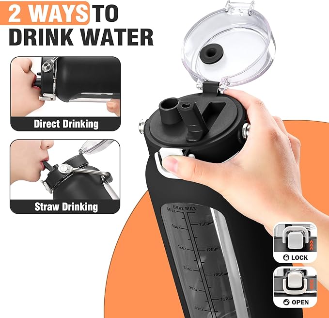 - Glass Water Bottle with Straw Lid: Our 64 oz glass water bottle, furnished with a convenient straw lid, showcases an innovative and fail-safe design. Its pioneering one-click button system simplifies the drinking process—just a gentle press and the lid opens automatically, ensuring a hassle-free experience.