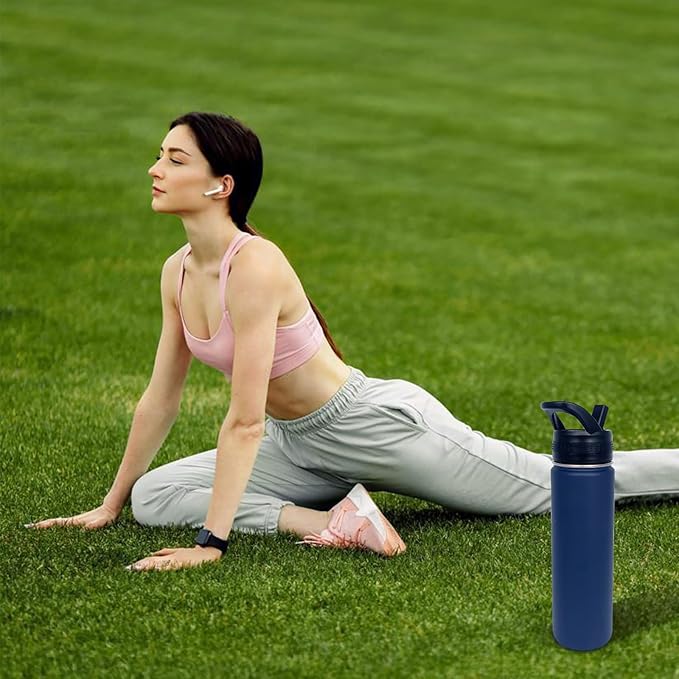 1pack 22 oz Insulated Water Bottle With Straw, Stainless Steel Sports Water Cup Flask with 2 Lids, Wide Mouth Travel Thermal Mug,Navy