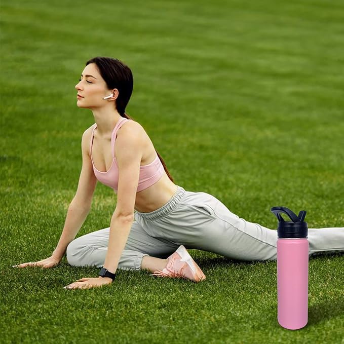 1pack 22 oz Insulated Water Bottle With Straw, Stainless Steel Sports Water Cup Flask with 2 Lids, Wide Mouth Travel Thermal Mug,Pink