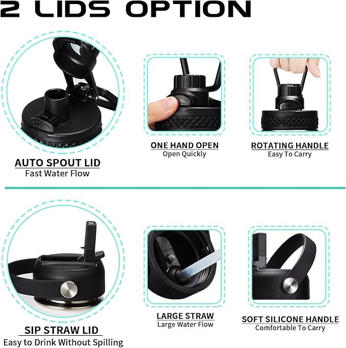 - 2 LIDS—100% Leak Proof: the auto spout cap & straw lid provide your different drinking experience. The ONE-HAND operation pop-up spout lid for convenient enjoy your fast water flow. The SPILL-PROOF straw lid with high flow rate & BPA free. Both 2 lids design with a sturdy handle, making the thermo water bottle more convenient to carry
