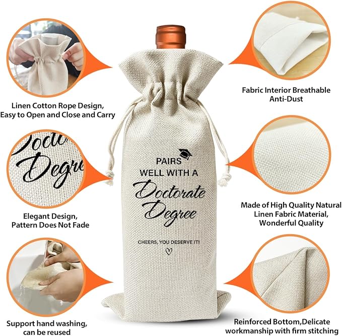 - PREMIUM MATERIAL: This Doctorate Degree Gift Wine Bag Is Made Of Cotton Linen Material, With Clear Patterns, Uniform Stitching, Not Easy to Fade, Strong and Durable, Wine Bag With Drawstring Setting, Easy to Close And Open and Keep The Things in Bag Safe and Mystery.