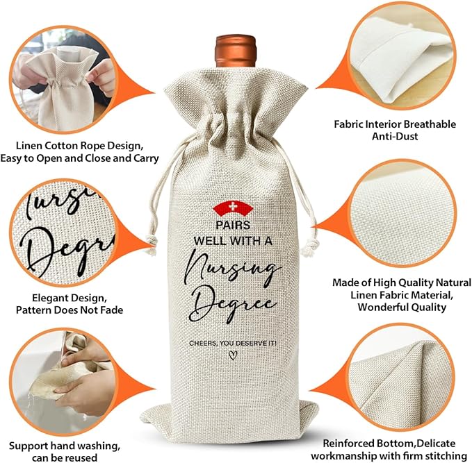 - PREMIUM MATERIAL: This Nurse Wine Bag Is Made Of Cotton Linen Material, With Clear Patterns, Uniform Stitching, Not Easy to Fade, Strong and Durable, Wine Bag With Drawstring Setting, Easy to Close And Open and Keep The Things in Bag Safe and Mystery.