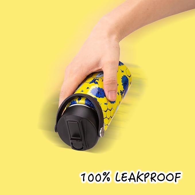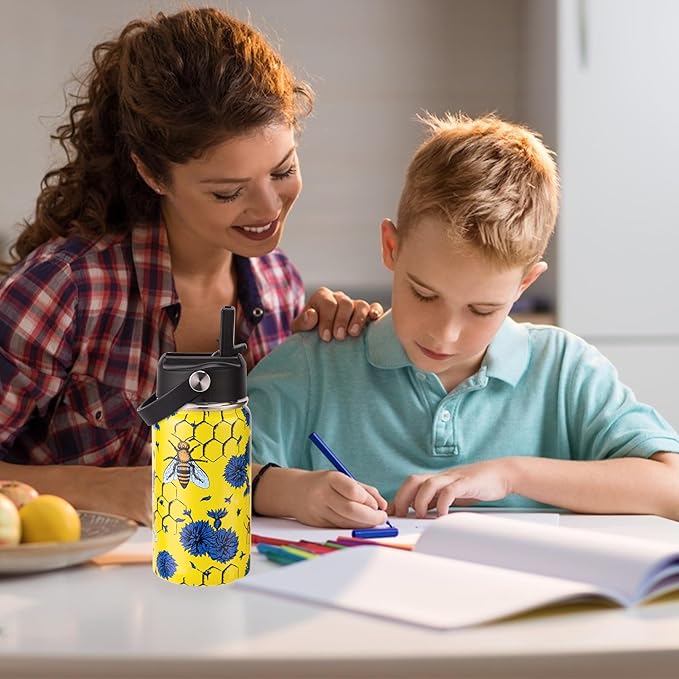 12oz Kids Insulated Water Bottle with Flip Straw & Big Handle, Bees & Flowers, Double Wall 18/8 Stainless Steel, Leakproof Gift for Kids Boys Girls to School Travel Sports, Hands Wash Only, Yellow