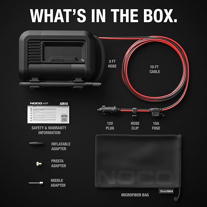 - WHAT'S IN THE BOX — AIR10 10-Amp Portable Car Tire Inflator with 3-Foot Braided Inflation Hose and a 10-Foot Power Cord with a 12V Cigarette Lighter Plug, Multiple Adapters (Presta Valve, Needle, and Inflatable Toy), Microfiber Storage Bag and 1-Year Limited Warranty.