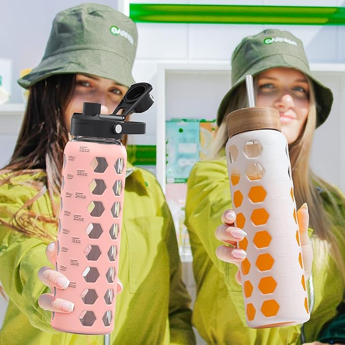 - GLASS WATER BOTTLES WITH TIME MARKER:MUKOKO 32oz glass water bottle with time marker preserves the purity of water.This is a very handy way to keep up with daily water intake,stay hydrated and healthy.