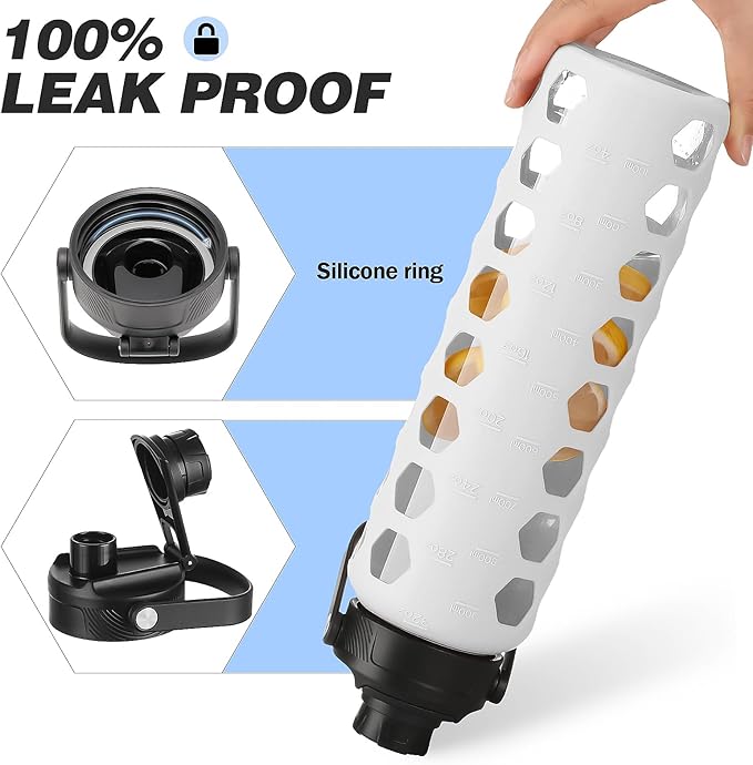 MUKOKO Glass Water Bottles, 32oz Glass Tumbler with Straw, Drinking Bottles with 2 Lids-Handle Spout Lid&Bamboo Straw Lid, Motivational Water Bottle with Time Marker and Silicone Sleeve, 1 Pack-White