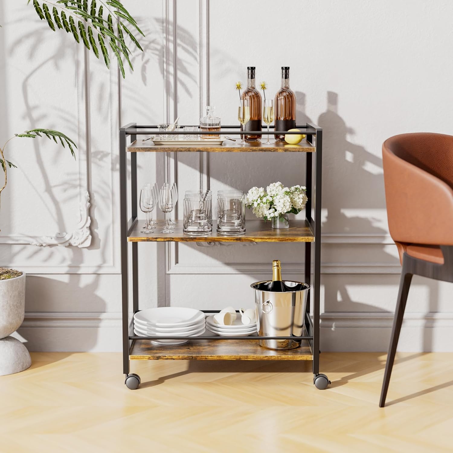 - ROBUST AND STABLE, 2 PROTECTIVE RAILS - Our bar cart boast a premium MDF and solid bamboo frame to ensure it can withstand heavy use and support all your items. The top and bottom shelves of rolling beverage cart have 2.36” height protective rails to keep stored items safe and prevent wine and glass bottles from rolling off
