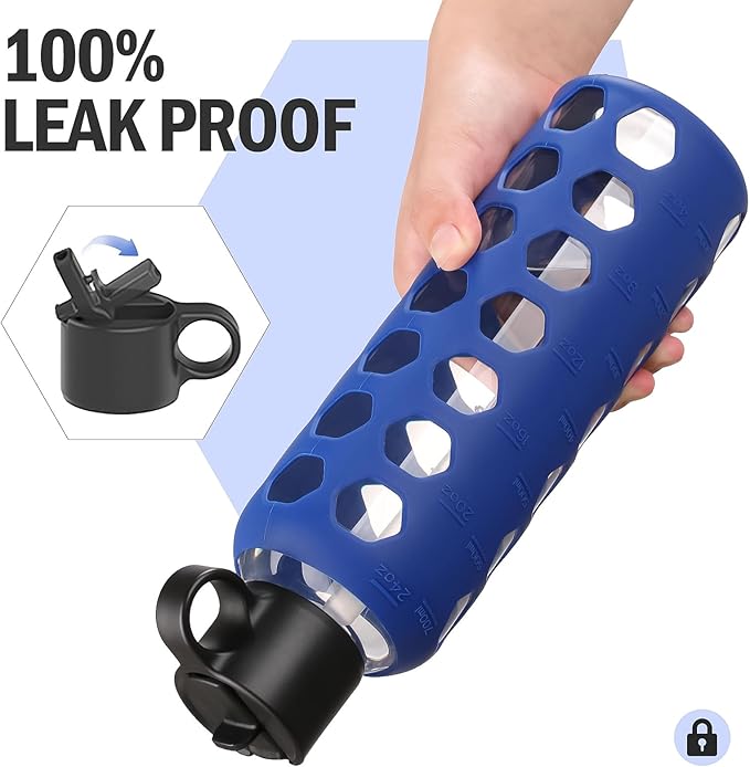 MUKOKO Glass Water Bottles, 24oz Glass Tumbler, Drinking Bottles with 2 Lids-Handle Flip Straw Lid&Bamboo Lid, Motivational Water Bottle with Time Marker and Silicone Sleeve, Leakproof-1 Pack-Blue