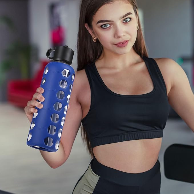 - GLASS WATER BOTTLES WITH TIME MARKER:MUKOKO 32oz glass water bottle with time marker preserves the purity of water.This is a very handy way to keep up with daily water intake,stay hydrated and healthy.