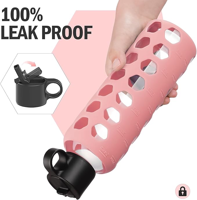 MUKOKO Glass Water Bottles, 24oz Glass Tumbler, Drinking Bottles with 2 Lids-Handle Flip Straw Lid&Bamboo Lid, Motivational Water Bottle with Time Marker and Silicone Sleeve, Leakproof-1 Pack-Pink
