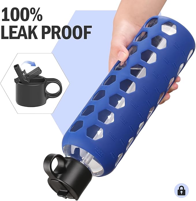 MUKOKO Glass Water Bottles, 32oz Glass Tumbler, Drinking Bottles with 2 Lids-Handle Flip Straw Lid&Bamboo Lid, Motivational Water Bottle with Time Marker and Silicone Sleeve, Leakproof-1 Pack-Blue