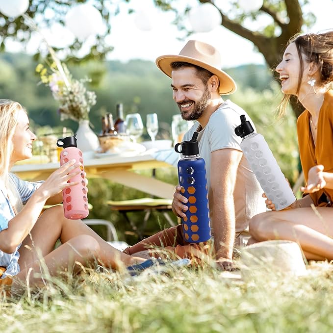 - GLASS WATER BOTTLES WITH TIME MARKER:MUKOKO 32oz glass water bottle with time marker preserves the purity of water.This is a very handy way to keep up with daily water intake,stay hydrated and healthy.