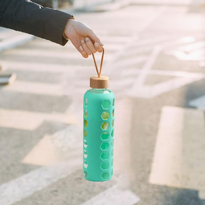 - GLASS WATER BOTTLES WITH TIME MARKER:MUKOKO 32oz glass water bottle with time marker preserves the purity of water.This is a very handy way to keep up with daily water intake,stay hydrated and healthy.