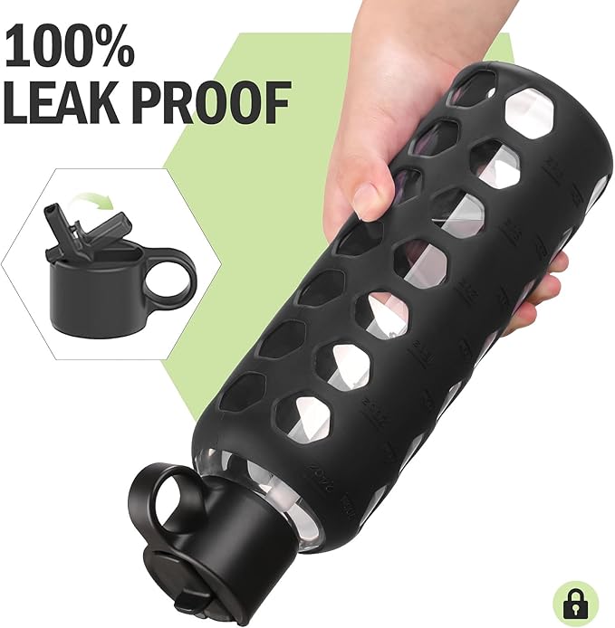 MUKOKO Glass Water Bottles, 24oz Glass Tumbler, Drinking Bottles with 2 Lids-Handle Flip Straw Lid&Bamboo Lid, Motivational Water Bottle with Time Marker and Silicone Sleeve, Leakproof-1 Pack-Black