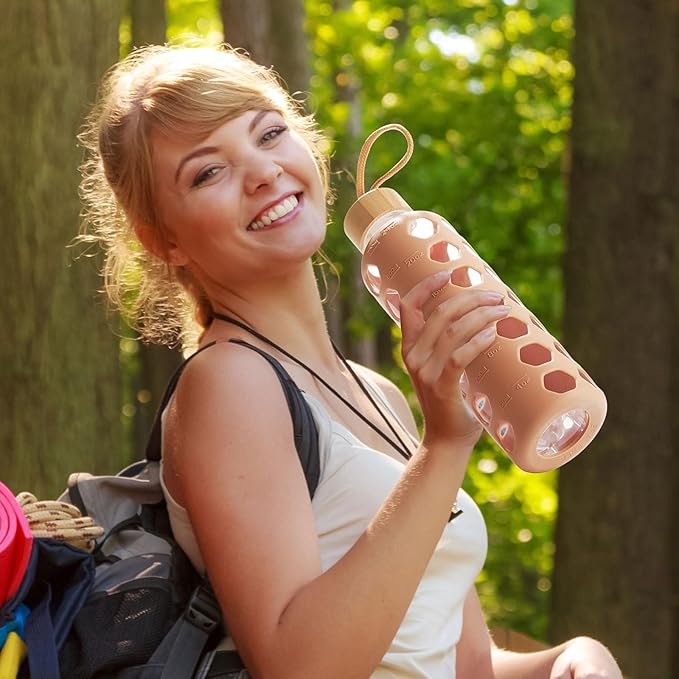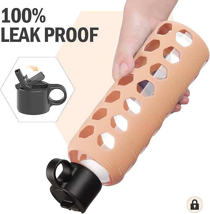 - GLASS WATER BOTTLES WITH TIME MARKER:MUKOKO 32oz glass water bottle with time marker preserves the purity of water.This is a very handy way to keep up with daily water intake,stay hydrated and healthy.