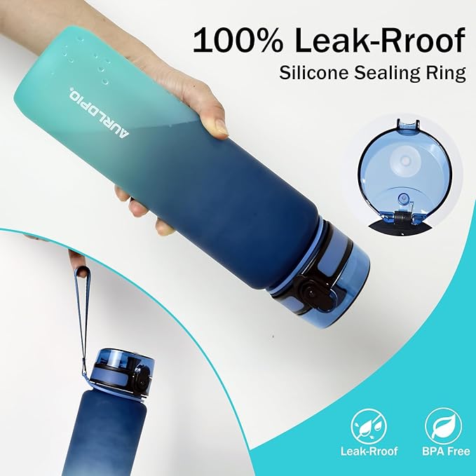 - 【HIGH-QUALITY DESIGN】 The Aurldpio drinking bottle is ergonomically shaped and features a durable hand strap and a special, reflective, frosted housing. It is 360° leak-proof, robust, durable and shock-resistant, making it easy to transport. The flip top lid also has a safety lock that prevents accidental opening. Use the additional cleaning brush to quickly clean your water bottle.