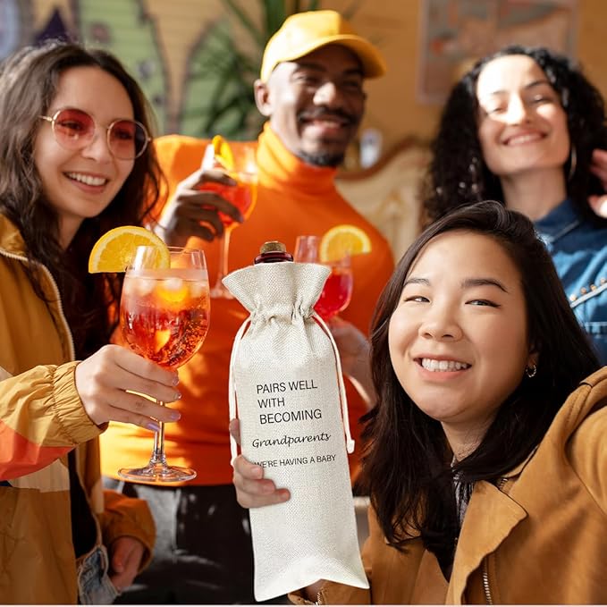 Burlap Wine Bags Gift for New Grandpa Grandma, Reusable Wine Gift Bags with Drawstrings for Pregnancy Announcement Baby Shower Thanksgiving Christmas Appreciation Party Home Storage - 01