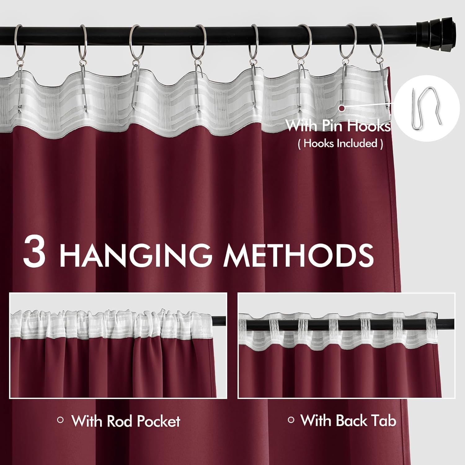 - MULTIPLE HANGING OPTIONS: Each panel features a 3-in-1 top style design: Rod Pocket, Back Tab and Pinch Pleat. The Back loop (2.3 "long) and rod pocket (3.1" long) fit most standard rods. Curtains also can be hung with clip rings or different type of hooks. We will GIVE AWAY 20 PIN HOOKS for each pair of curtains for your convenience (rings won't be included). PLEASE NOTE THAT FOR THE PLEAT HANGING METHOD, VISIBLE PLEATS CAN ONLY BE ACHIEVED BY USING 4 PRONG HOOKS, AND WE ONLY PROVIDE PIN HOOKS.