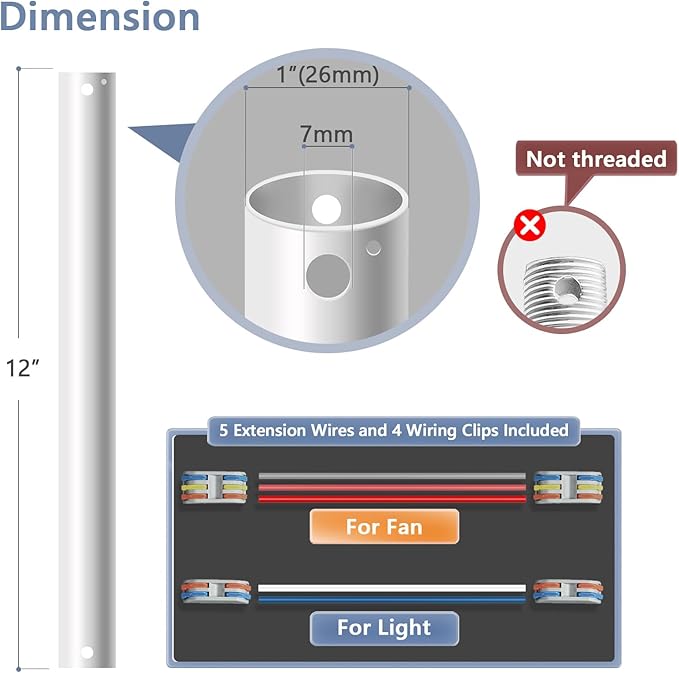 12" Ceiling Fan Downrod, 【1 Outside Diameter】 Matte White Extended Downrod, including 4 Wire Connectors and 5 Extension Wires (No Threads)