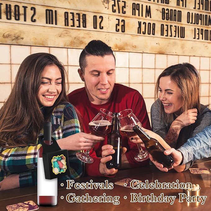 - UNIVERSAL SIZE - Wine bottle hanging boxes are 3.5 x 3.5 x 1.2 inches / 9 x 9 x 3 cm in size, and the hanging hole size is 1.5in / 3.8cm. Thick cardboard material makes gift box with window durable and easily to hang on various size glass bottles such as champagne, prosecco, beers, and also plastic bottles like soda and water bottle.