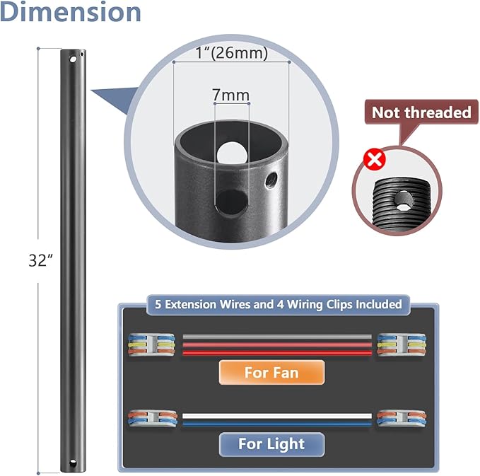 - 【Ceiling Fan Downrod Dimensions】Length: 32 inches, Outer diameter: 1 inch (26 millimeters), suitable for ceilings up to 9 feet high, ensuring both aesthetics and maximum airflow. (Extension rod length can be cut on-site)