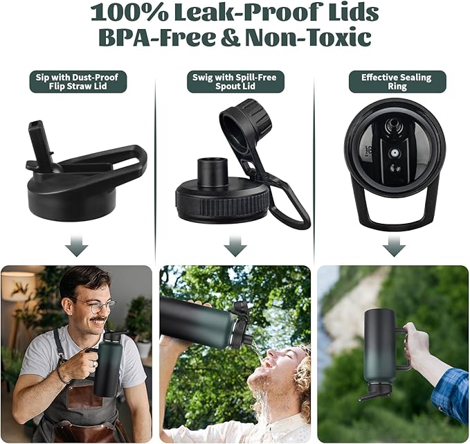 - 💦【2 Leak-Proof Lids】Say goodbye to spills and leaks! This insulated water jug comes with 2 lids to meet your different drinking needs. The spill-free spout lid allows for one-handed opening and closing with a large drinking spout for quick sipping. The dust-proof flip straw lid makes sipping on-the-go easy and prevents ice from getting in. The lids feature a silicone ring to prevent splashing and dripping when overturned or shaken.
