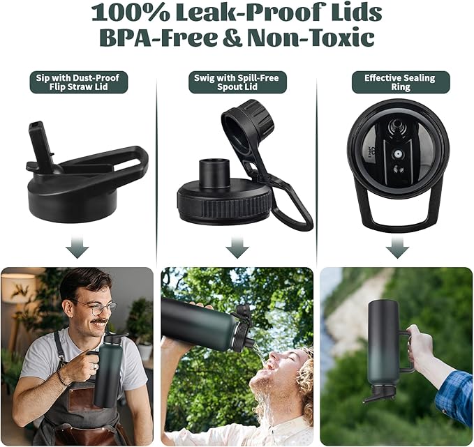 - 💦【2 Leak-Proof Lids】Say goodbye to spills and leaks! This insulated water jug comes with 2 lids to meet your different drinking needs. The spill-free spout lid allows for one-handed opening and closing with a large drinking spout for quick sipping. The dust-proof flip straw lid makes sipping on-the-go easy and prevents ice from getting in. The lids feature a silicone ring to prevent splashing and dripping when overturned or shaken.