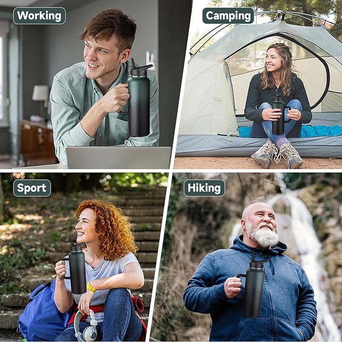 - 💦【Hot/Cold Insulated Water Bottle】This 40 oz water bottle stainless steel features advanced vacuum insulation technology, keeping hot drinks hot for 8 hours and cold drinks cold for 12 hours. Enjoy a chilled beverage after intense exercise or a hot coffee during winter camping. The wide mouth design allows for easy cleaning and ice cube filling.